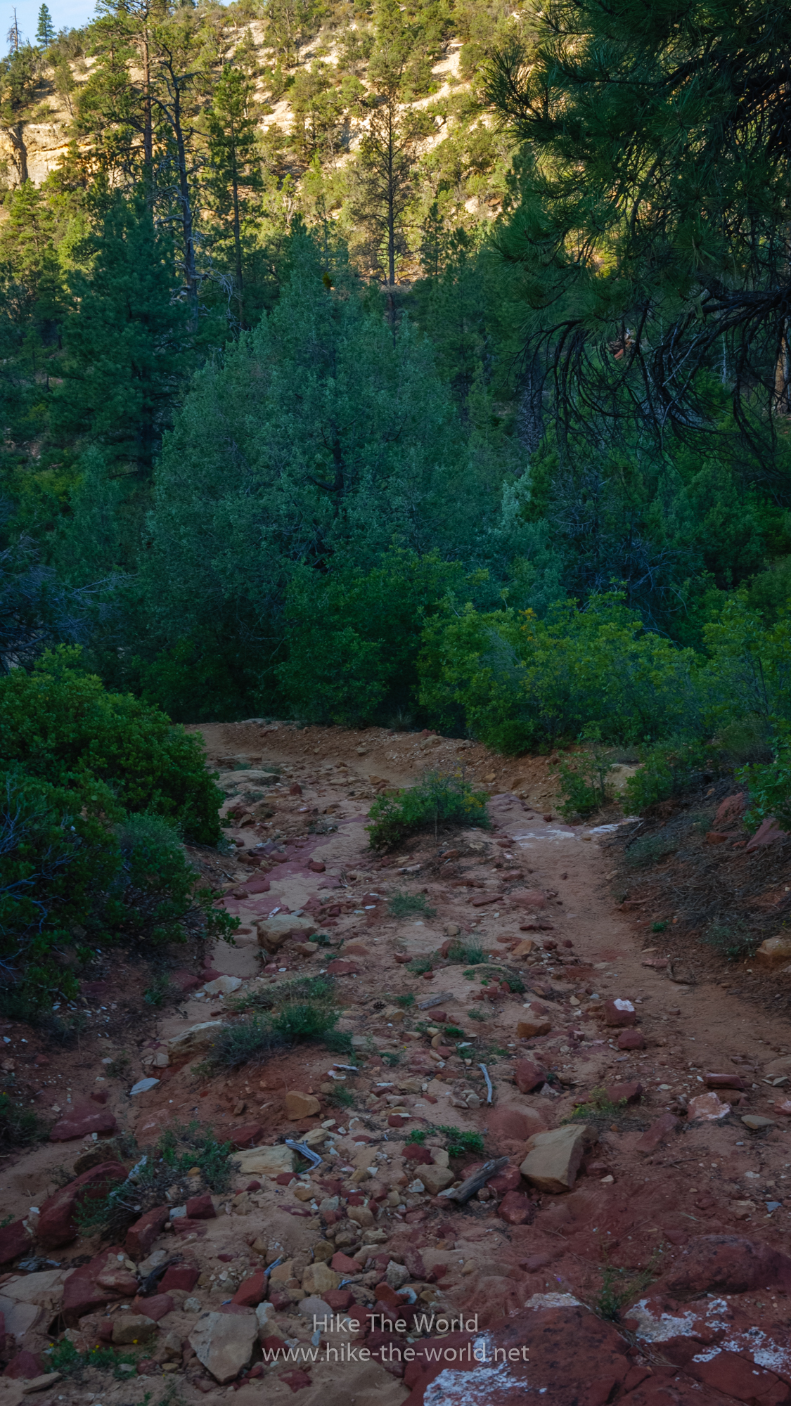 Getting back to the East Rim Trail is easy, you just have to follow the Trail you took to get to Cable Mountain and you’ll get back towards Stave Springs. Back in the 1920 there was a Lumber Mill at Stave Springs, today nothing is left. From here the trails continues via Echo Canyon to Weeping Rock. After some time, there’s a sign, telling you it’s only 4.5 miles (7 km) to Weeping Rock.